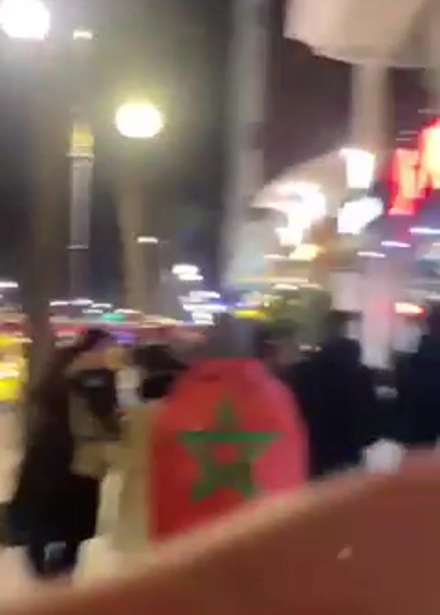 night-time scene with people walking along a city street, lit by streetlights. The camera moves, following the group. There are buildings visible with illuminated signs, including one that reads "Dr. Moore". The sound of car horns can be heard, suggesting traffic congestion. The camera pans to show cars lined up on a road, with the red lights of the cars visible. The video appears to capture a celebratory atmosphere, possibly related to a sports victory, as evidenced by the presence of Moroccan flags.