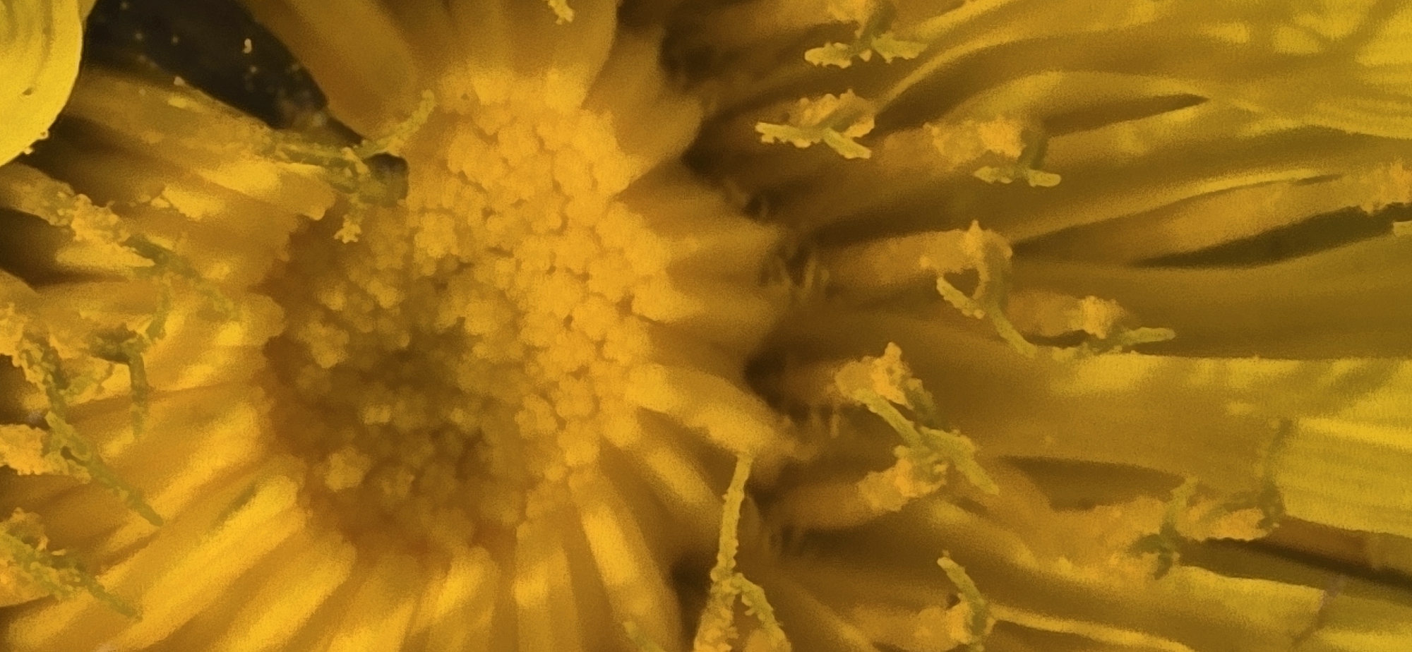 This image presents an extreme macro-level, forensic view of the internal structures of a yellow flower, photographed in Les Ulis, France. The frame is densely filled with shades of yellow and orange-yellow. The upper-central portion of the image displays a concentrated cluster of small, granular, bright yellow structures, consistent with a central disk of florets densely covered in pollen. Radiating outwards and downwards from this central area are numerous elongated, vibrant yellow structures, indicative of petals or ray florets. These structures exhibit varying degrees of focus, contributing to a sense of depth within the tightly cropped scene. In the lower half and mid-ground, numerous individual, slender, branching structures emerge, typically light yellow-green in hue, often terminating in bifurcated tips or exhibiting granular yellow deposits consistent with pollen adhering to stigmas or anthers. A limited, dark, indistinct area is visible in the upper right, suggesting a deeply shadowed background or extreme shallow depth of field within the flower itself. No people, discernible actions, or external environmental features are present beyond the floral components.