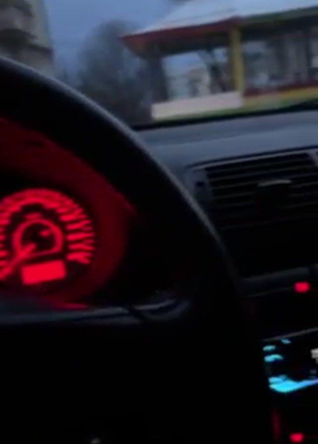 The view from inside a car shows the dashboard illuminated in red, with the steering wheel and dashboard vents in the foreground