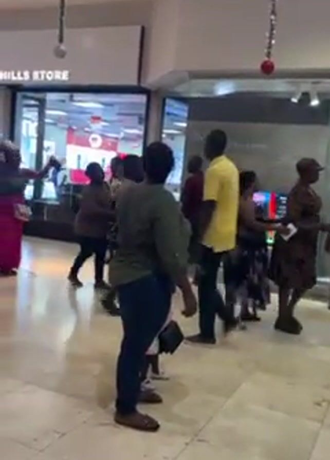 crowd of people moving quickly through a mall. Many are wearing casual clothing and appear to be running. A few people are standing and observing the crowd. There are several stores visible with glass windows. The floor is made of light-colored tile. There are Christmas decorations hanging from the ceiling. The atmosphere seems chaotic and urgent.