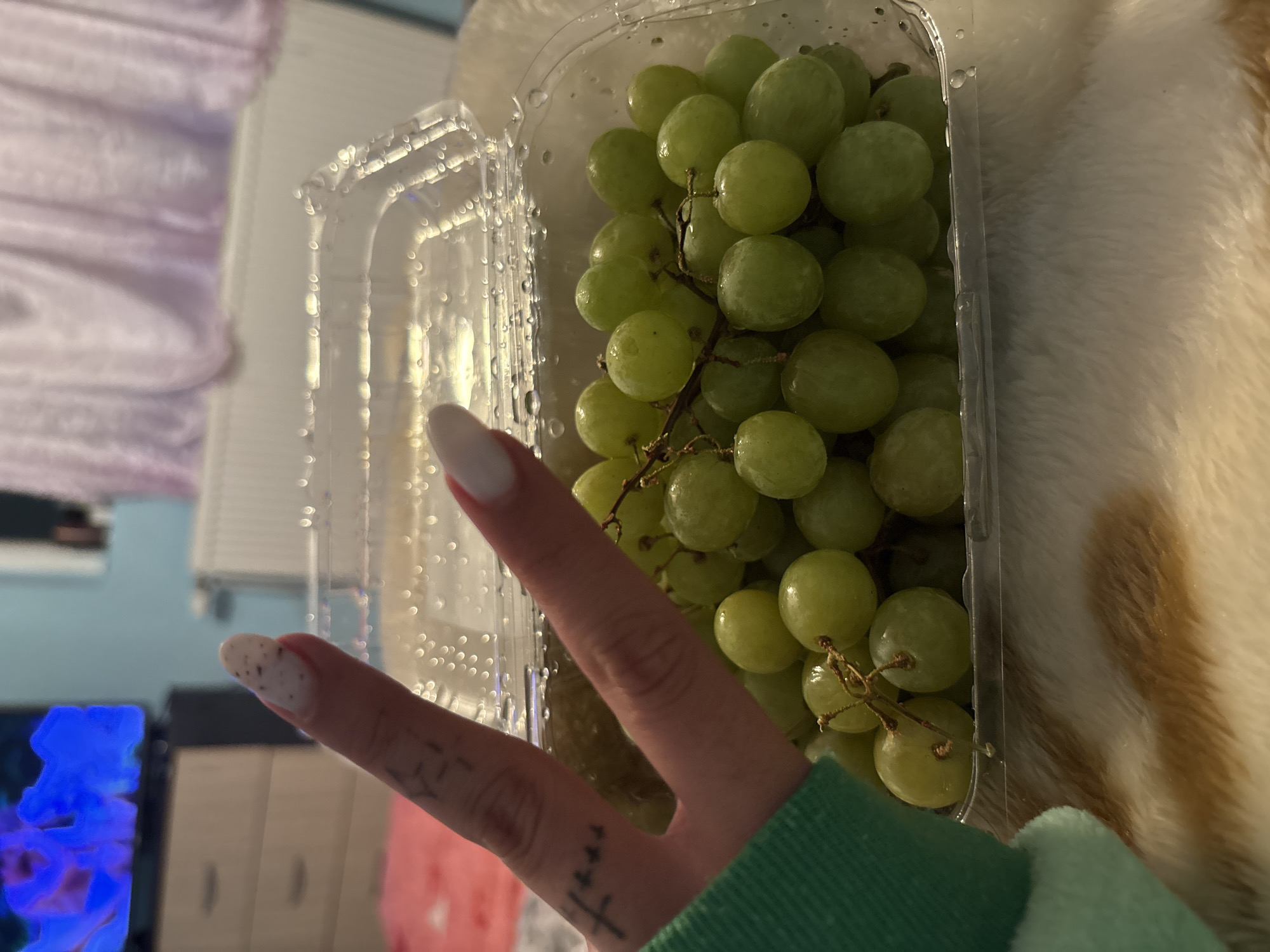 The image presents a close-up, elevated view of a human left hand forming a V-sign with its index and middle fingers, positioned directly above an open clear plastic container filled with green grapes. The hand is partially covered by a green long-sleeved garment. The index finger displays a white-tipped nail with small dark speckles, while the middle finger features a solid white-tipped nail. Small, dark linear tattoos are visible on the fingers. The clear plastic container holds numerous light green, moist grapes, some still attached to their short brown stems. The container's lid is open and rests slightly to the right, showing condensation droplets on its inner surface. The container rests on a surface covered by a patterned brown and cream-colored faux fur material. The background, largely out of focus, reveals an indoor setting in Kastel, Bulgaria, characterized by a light blue wall, a wooden dresser with two visible drawers, a television displaying a vibrant blue, abstract image, a white radiator, and sheer, light purple curtains.