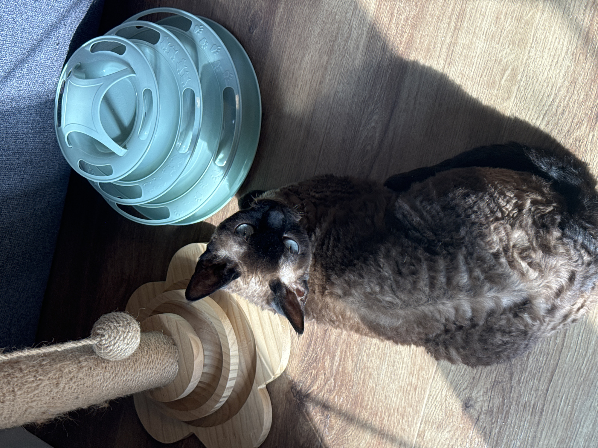 A high-angle shot shows a brown Devon Rex cat looking upwards on a wooden floor, near a blue cat toy and a cat scratching post