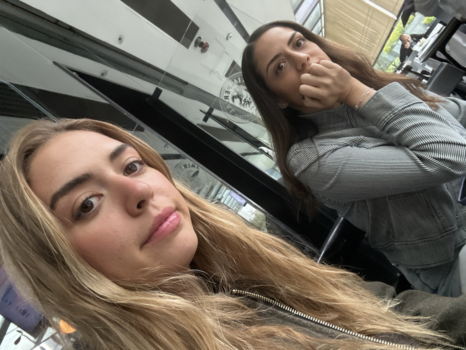 Two young women are seated inside a modern restaurant or cafe in Mexico City