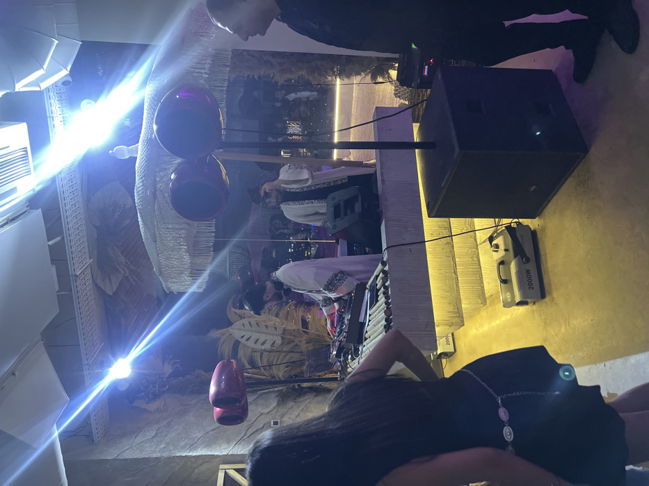 The image depicts an indoor performance scene at night within a venue in Yerevan, Armenia. **People:** * In the immediate foreground, a female with long dark hair, wearing a black dress and a silver chain belt, stands with her back to the camera, facing the performance area. * Centered in the mid-ground are two bearded males performing. The left individual, wearing a white patterned robe and headphones, is actively operating DJ equipment and mixers on a low stage. The right individual, also bearded and wearing a similar white patterned robe and sunglasses, stands next to him, possibly holding a microphone or adjusting equipment. * To the far right, a male in dark attire stands in profile, observing the performance. * Blurred figures of other attendees are visible in the background through a large glass partition or open area. **Subjects/Objects:** * The performance area features a multi-tiered DJ booth with a concrete-like base illuminated by yellow LED strips and a top surface adorned with bamboo-like elements where the DJ equipment is placed. * Audio equipment includes a large black subwoofer speaker on the floor, and two maroon horn-shaped speakers mounted on poles. One pole is positioned directly in front of the subwoofer. A stage monitor is visible on the DJ booth. * A "2000W" fog machine rests on the floor in front of the DJ booth. * Overhead, a large, intricate white fringed umbrella-like decoration is suspended, with a plastic water bottle placed on its top. * The background walls feature decorative elements resembling dried leaves or abstract natural patterns. * A bright, intense spotlight emits a strong blue-white beam from the ceiling, contributing to lens flare. * Beyond the glass partition, blurred city lights are visible, indicating an elevated or open-air setting. **Actions/Interactions:** * The two central males appear to be actively engaged in a live DJ/musical performance. * The foreground woman and right-side male are observing the performance. **Environment:** * The venue is dimly lit, with strategic lighting highlighting the performance area. The aesthetic blends modern concrete elements with natural and ethnic-inspired decor. The presence of city lights suggests an outdoor or semi-outdoor section overlooking the city.