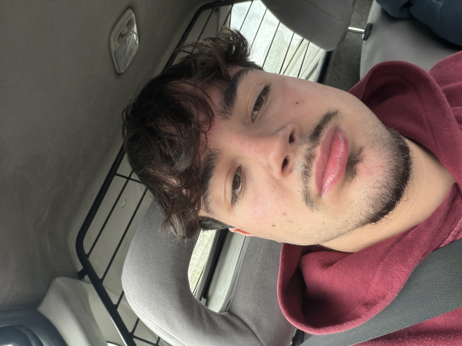 A young adult male is depicted in a close-up self-portrait taken inside a vehicle in the city of Peso da Régua, Portugal