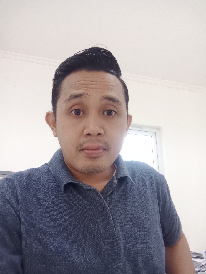 A close-up captures a man with dark hair styled upward. He has brown eyes and a slight mustache. He wears a dark blue polo shirt. The background is a plain white wall with a white window frame visible on the right. The lighting is bright and even, emphasizing the man's features and clothing texture.