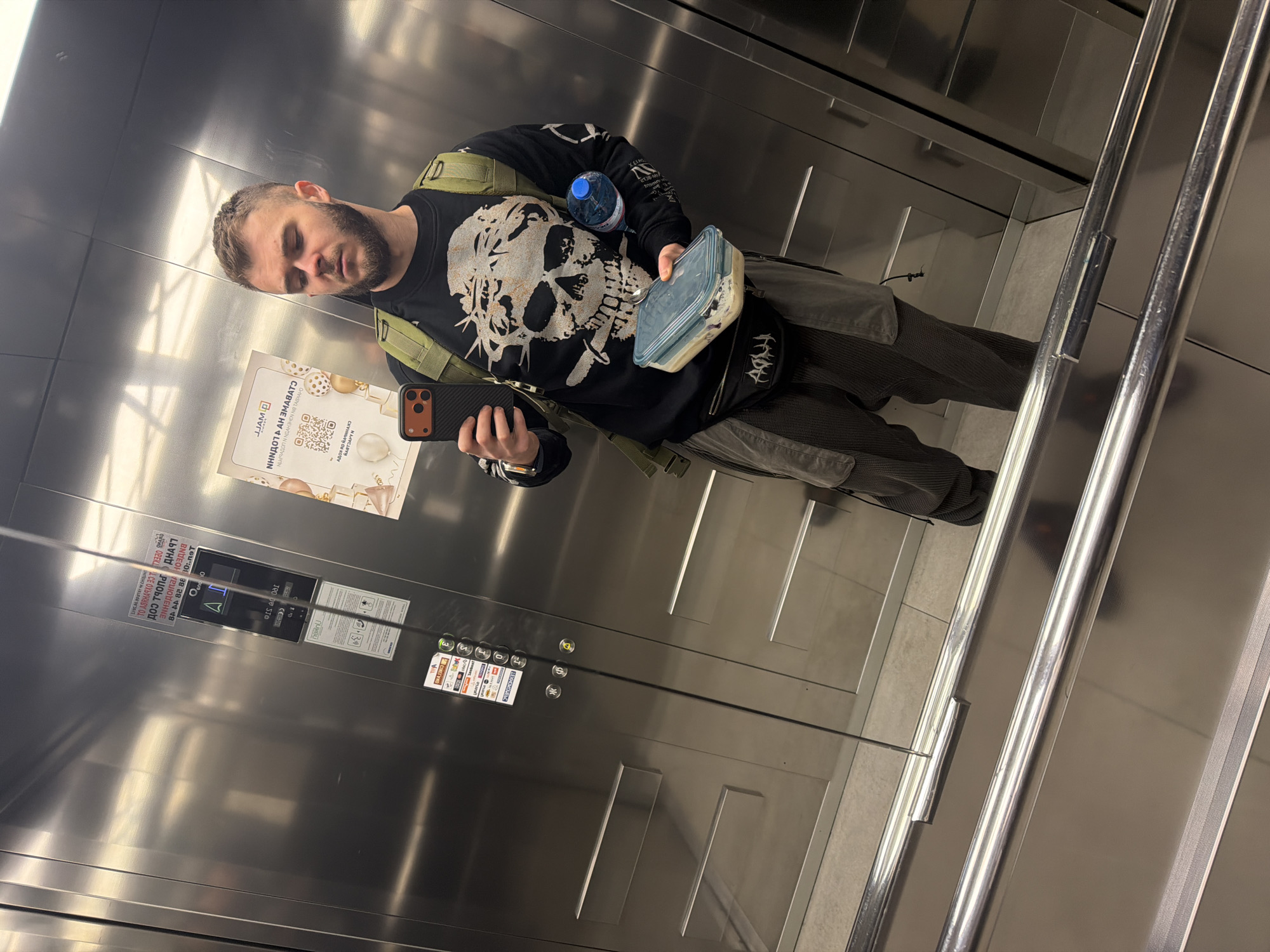 A man in an elevator takes a selfie with his cell phone. He is wearing a black long-sleeved shirt with a skull design, grey pants, and a backpack. He is holding a blue plastic container with food in his right hand and a bottle of water sits atop the container. A sign is visible in the elevator, featuring a QR code and text in Bulgarian, including the word "Mall" and indicating it is an advertisement for a shopping center. The elevator is stainless steel and the man is reflected in the walls. A panel with elevator buttons is also visible. The location is inferred to be Pernik, Bulgaria, based on the language of the advertisement.