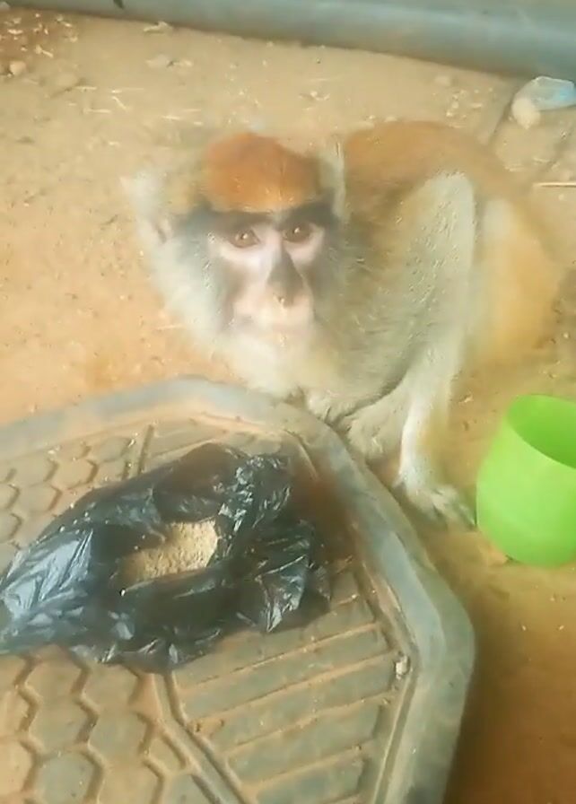 - "A monkey sits on a dusty surface near a black plastic bag of food and a green cup" by FM-4ILJx1, licensed under CC BY 4.0