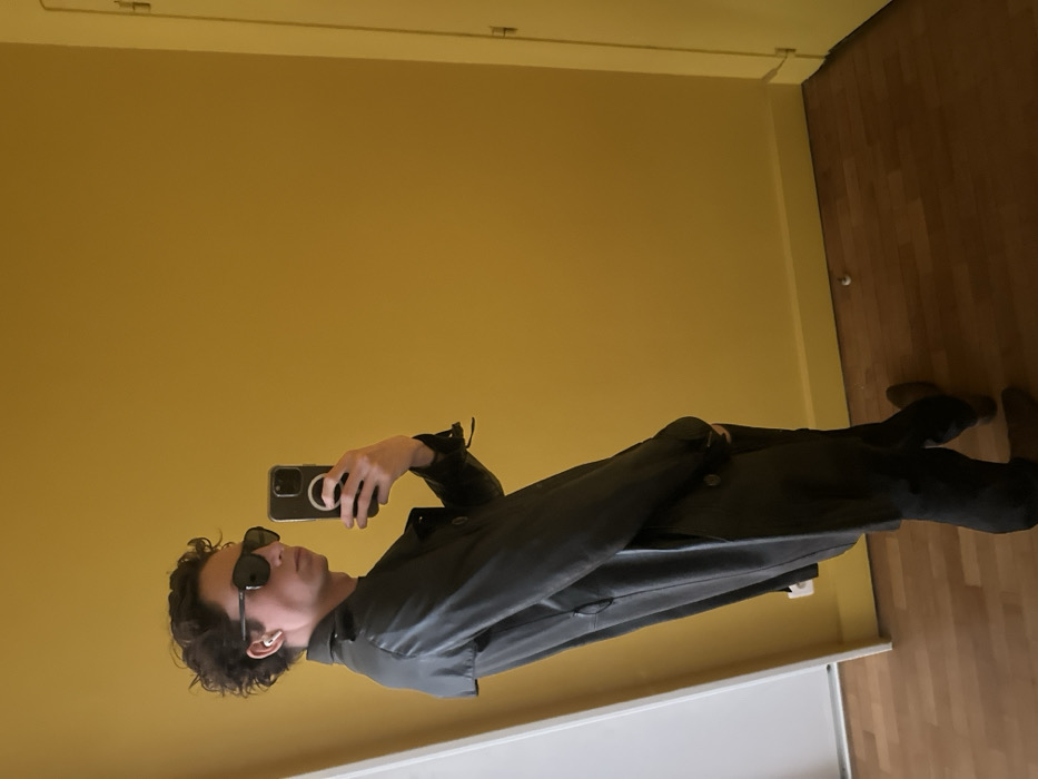An individual, appearing male, with dark, curly hair, dark sunglasses, and a white earbud in his left ear, stands angled in an interior room in Paris, France. He is wearing a dark, possibly leather, trench coat, dark trousers, and dark brown shoes. His right hand holds a dark-colored smartphone, equipped with a magnetic accessory ring, angled to capture his reflection, indicating he is taking a selfie in an unseen reflective surface. The background consists of a plain mustard-yellow wall, a light brown wooden floor with visible grain, and a white baseboard. Partially visible architectural elements include a white vertical frame on the left and a light-colored door frame with a hinge on the right. A small, light-colored spherical object rests on the floor near the wall on the right side of the frame.