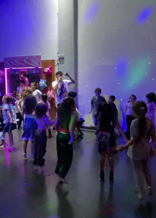 group of children dancing at a party. A man with a microphone appears to be directing the children, who are of varying ages and dressed in casual clothing. The setting appears to be an indoor party venue, decorated with neon lights and balloons. One display reads "Alma 5 avent." The floor is reflective, and the lighting is multicolored, creating a party atmosphere. The children are actively participating, jumping, and moving around the room.