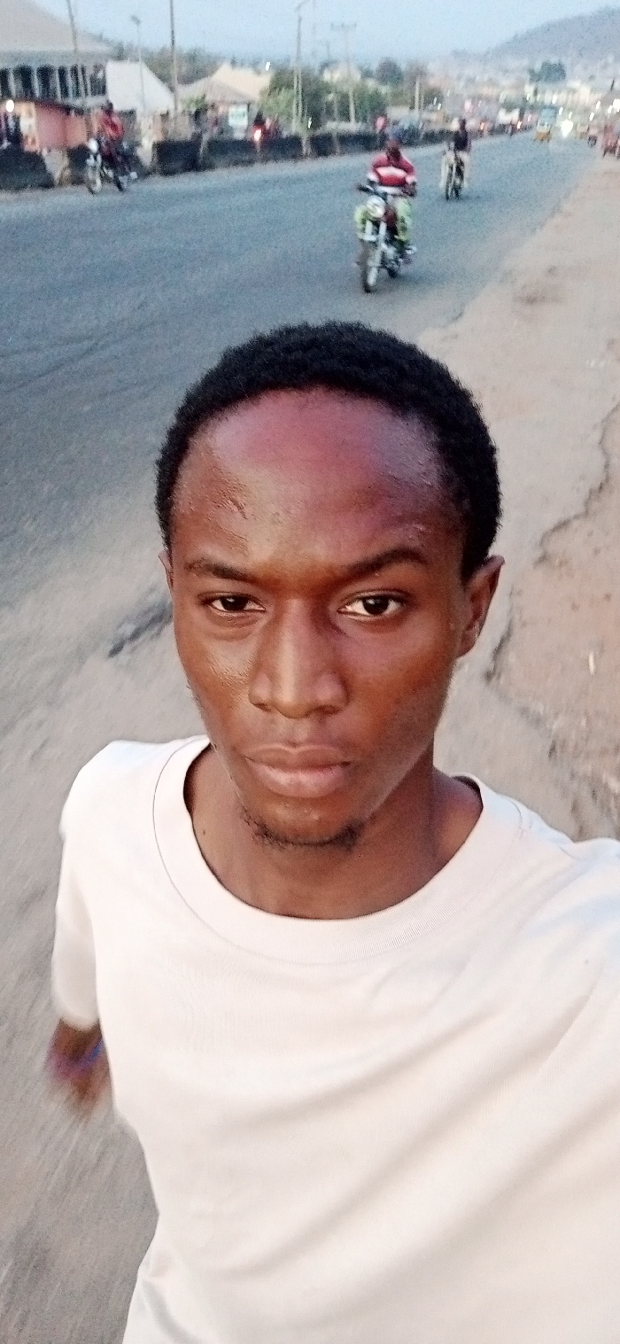 A young man wearing a white t-shirt is centered in the frame, facing the camera. The background shows a roadway with several motorcycles and some buildings in the distance, suggesting an urban or semi-urban setting. The overall image has a slightly muted color palette, likely due to the time of day or lighting conditions. The man's expression is neutral, and the photo appears to be a casual snapshot.