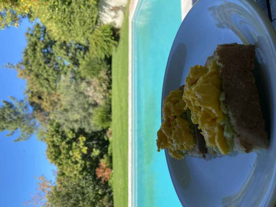 This image captures an outdoor breakfast scene at an unspecified private residence within Ponte de Lima, Portugal. In the immediate foreground, a white, round plate holds two servings of avocado toast topped with scrambled eggs. The toast is light brown, with a layer of mashed green avocado visible beneath the bright yellow, textured scrambled eggs. The plate is partially shaded. Directly behind the plate, a vibrant blue swimming pool occupies the midground, its water appearing calm and clear. The pool has a light-colored edge. Beyond the pool, a well-maintained green lawn stretches towards the background. The furthest background features a dense, lush garden area with various trees and shrubs displaying different shades of green foliage, some with hints of orange or red. A tall evergreen tree is prominent on the left side of the background. A light-colored wall or building exterior is visible on the far right, partially obscured by greenery. The sky above is clear and bright blue, indicating daylight and fair weather conditions. No individuals are present in the frame.
