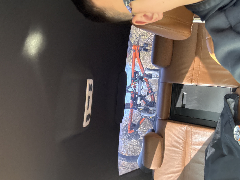 The scene is captured from inside a vehicle, looking towards the rear. In the foreground, the upper right portion of an individual's head, ear, and a section of blue-patterned eyewear are visible, suggesting the perspective of a person in the front passenger or driver's seat. This individual wears a dark-colored garment. The vehicle's interior features a dark headliner with a rectangular overhead light fixture. Brown leather rear seats with headrests are prominent, and a black panel, possibly a pass-through, is integrated between the seats. A dark blanket or garment lies on the left rear seat, partially covering a silver beverage can with a red top. Through the vehicle's rear window, two orange and black full-suspension mountain bikes are visible, mounted on an external bike rack. The bikes are oriented with their frames parallel to the vehicle's rear. The outer environment, consistent with a location like Gorno Kamartsi, Bulgaria as specified, shows a sparse wooded area with bare tree branches, suggesting a non-foliage season. A clear blue sky is visible above the trees. Sunlight illuminates the outdoor scene and casts shadows across the vehicle's rear interior. No specific actions or interactions are depicted beyond the static arrangement of objects and the presence of the individual taking the image.
