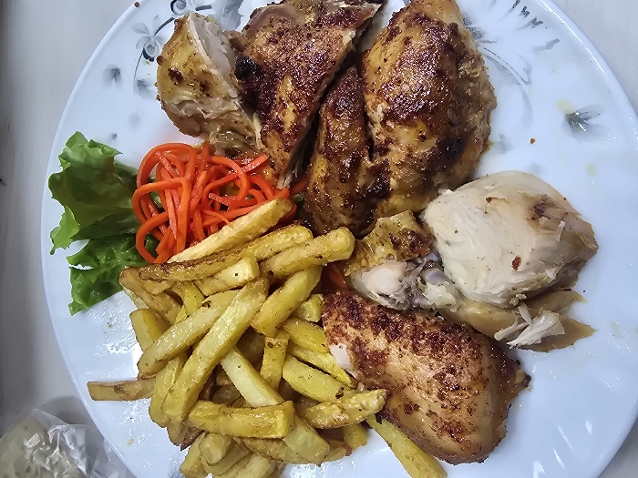 A white plate holds a serving of food. Several pieces of cooked chicken are arranged on the plate, some with crispy browned skin. Next to the chicken is a pile of golden-brown french fries. Strips of orange shredded carrots are positioned between the fries and chicken. A green lettuce leaf provides a pop of color next to the carrots. The plate has a subtle floral pattern around the edge.