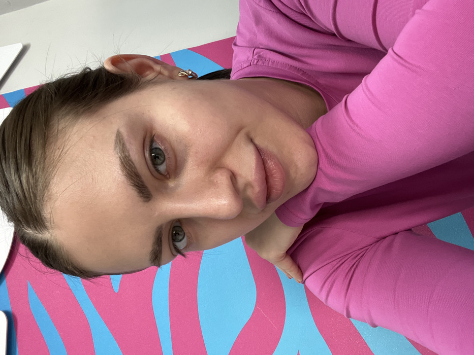 A female individual is depicted in a close-up, chest-up shot. She has light skin, dark brown hair parted in the center, and pulled back. Her eyes are light green, and she has full lips. She wears a long-sleeved, fuchsia-colored top. A small, gold-toned hoop earring is visible in her right ear. Her left hand is positioned to support her chin/jawline. The background features a wall with an abstract pattern of horizontal, wavy stripes in alternating fuchsia and light blue. A small portion of a white surface is visible in the upper right of the background. The specific location within the city of Rostov-on-Don, Russia, cannot be determined from the provided image.