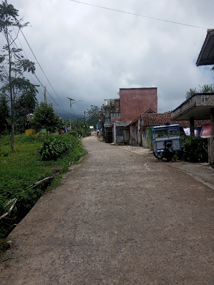 The image depicts an unpaved road in Ura-Dozhi, Bhutan, under a heavily overcast sky. The road, composed of dark gravel and dirt, extends from the foreground into the distance, appearing to curve slightly to the left. On the left side of the road, a green embankment is covered with dense vegetation, including a large tree with sparse foliage in the foreground and various bushes and smaller trees extending into the midground. A narrow ditch or drainage channel runs along the immediate left edge of the road. Utility poles with multiple overhead wires span the scene, and a solar-powered streetlamp is visible further down the road on the left. On the right side of the road, a series of structures line the thoroughfare. In the immediate foreground on the right, a portion of a concrete overhang is visible, with laundry items hanging from what appears to be a clothesline. Adjacent to this, a dark-colored motorcycle is parked next to a blue and white enclosed cart-like structure. Further along, a building with a reddish-brown tiled roof is present, followed by a prominent, rectangular, reddish-brown two-story building with a flat top. Additional buildings, varying in construction and condition, are visible further down the road on the right. No individuals are present in the frame. Distant hills or mountains are partially obscured by the cloudy sky in the background.