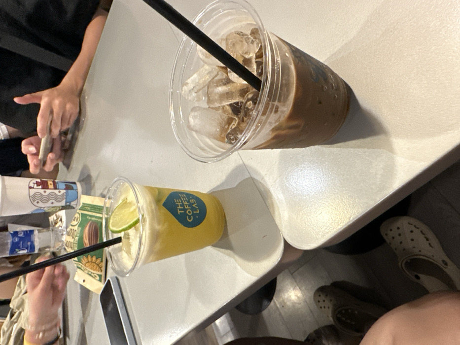 The image depicts an indoor scene at a "The Coffee Lab" branch, specifically in Thủ Đức, Vietnam. Two plastic beverage cups are positioned on a light grey table with rounded corners. The left cup contains a yellow-orange liquid with white foam and a lime slice, featuring a blue "THE COFFEE LAB" logo. A black straw is inserted. The right cup holds iced coffee, characterized by a brown liquid and numerous ice cubes, also with a black straw. In the background, on the same table, a clear plastic water bottle, a white paper cup with abstract black and white patterns, a green and brown packaged snack item, and a light-colored smartphone placed face down are visible. Two individuals are present: one person's hand with a white wristband is partially visible on the far left, and another person's hands are seen holding and interacting with a smartphone horizontally on the right. Below the table, on the bottom left, a pair of light brown Crocs-style clogs are visible on a hard floor surface. Overhead lighting illuminates the scene, casting shadows from the objects onto the table.