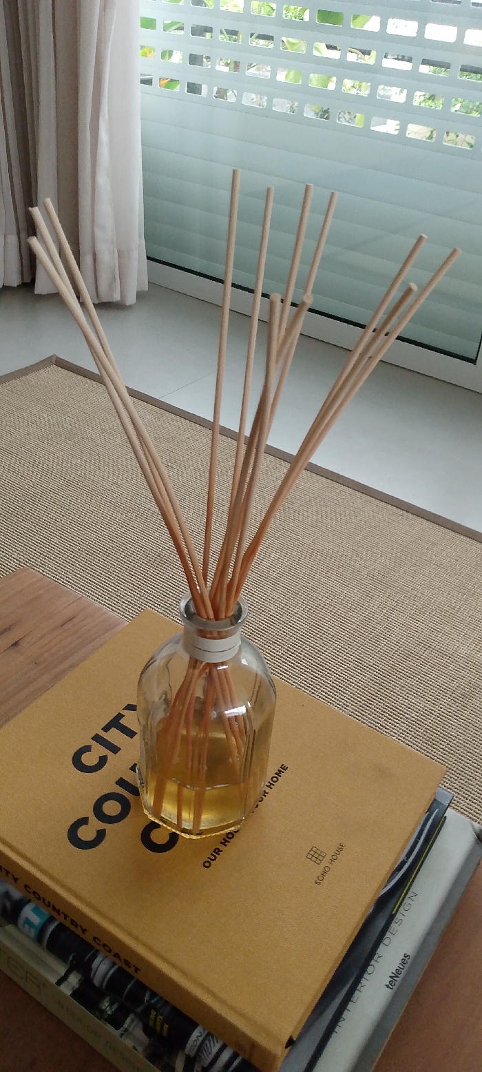 The image depicts an indoor scene within the city of Alaguntan, Nigeria. In the foreground, a clear, faceted glass diffuser bottle containing a light amber liquid is visible. Approximately 15-20 light-colored wooden reeds are inserted into the bottle. The diffuser rests on a stack of two hardcover books. The top book is tan-colored, displaying partial black text including "CITY COUNTRY COAST" and the "SOHO HOUSE" logo, with "OUR HOME" also visible. Beneath it, a darker book shows partial white text, "INTERIOR DESIGN teNeues". These books are positioned on a dark wooden surface. In the background, a light tan-colored woven rug with a dark brown border covers part of the floor. Further back, a cream-colored curtain hangs vertically to the left of a window or glass door. Through the window/door, a white, rectangular latticework screen is visible, with glimpses of green foliage beyond, indicating an outdoor area. The scene is illuminated by natural light from the exterior opening. No individuals are present.