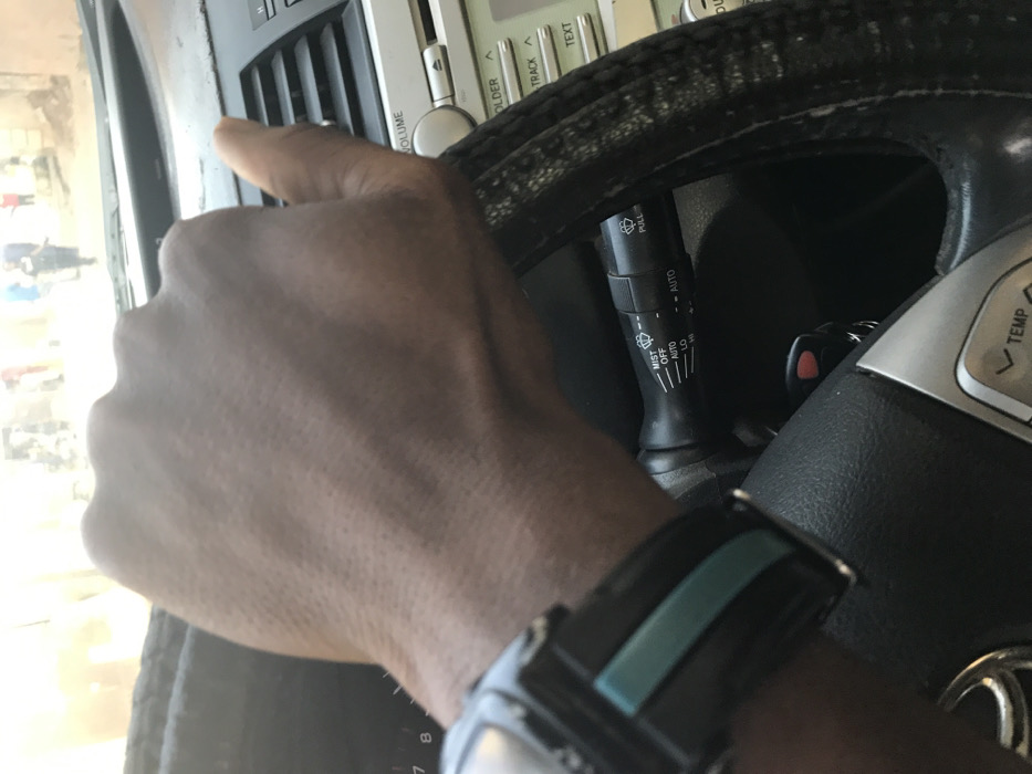 The image presents a first-person perspective from inside a vehicle in Jos, Nigeria, during daylight. A dark-skinned right hand, wearing a black digital watch with a teal accent band, grips the upper right quadrant of a steering wheel. The steering wheel is covered with a dark, possibly textured material, and features silver spokes with control buttons, including one marked "TEMP," and a partial Toyota emblem at its base. Behind the steering wheel, a black stalk for wiper controls is visible, showing settings such as "MIST," "OFF," "AUTO," "LO," and "HI." A red and black car key fob is partially visible, hanging near the ignition area, obscured by the steering wheel. To the right, a section of the car's dashboard is visible, featuring a silver-colored audio unit with "VOLUME," "TRACK," and "TEXT" buttons, alongside an air vent. The scene outside the vehicle's windshield is significantly blurred, depicting an unpaved street with several indistinct pedestrians and faint outlines of light-colored structures, suggesting an active urban or semi-urban environment.