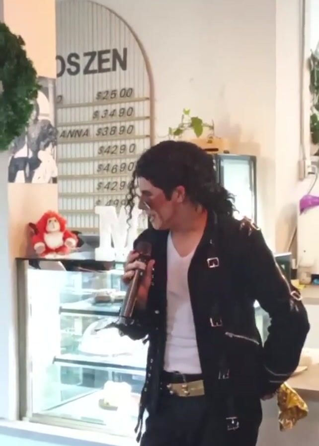 A person dressed as Michael Jackson sings into a microphone while standing inside what appears to be a cafe