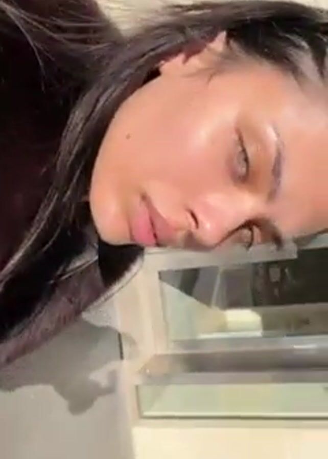 A woman with dark hair, fair skin, and light-colored eyes looks directly at the camera. The video appears to be taken outdoors in sunlight. She wears a dark-colored, furry coat. The camera angle is from slightly above, looking down at her face. The background is a neutral color, possibly a sidewalk or building exterior. The camera is slightly tilted and then rotated.