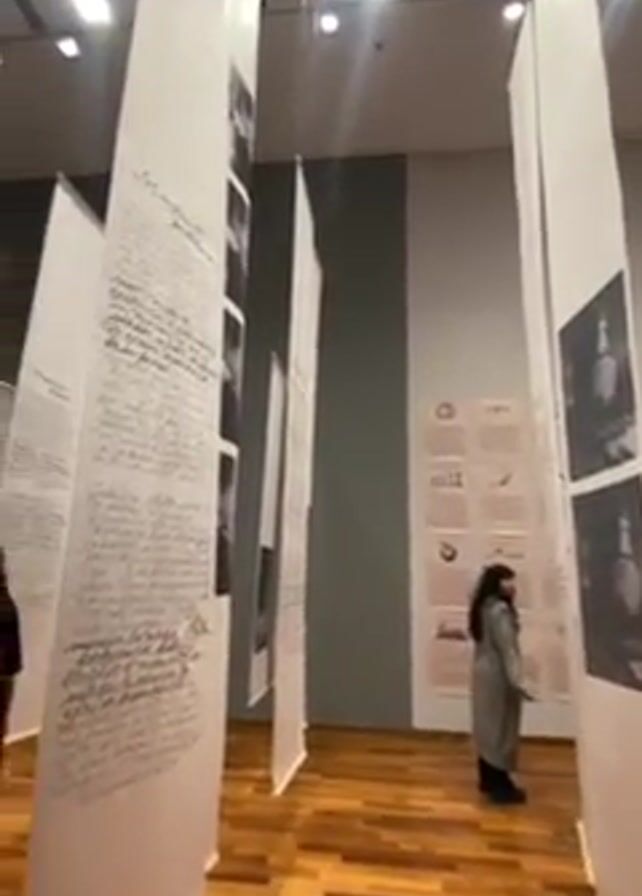 The video showcases an art exhibit within a brightly lit gallery space. The main feature of the exhibition is the installation of several tall, rectangular white banners hanging from the ceiling. These banners are covered with handwritten text, and black and white photographs. People are seen walking through and observing the exhibition, including one person taking a photo of a banner with a smartphone. The gallery has a polished wooden floor. In the background, additional art pieces are displayed on the walls. The atmosphere is calm and contemplative.