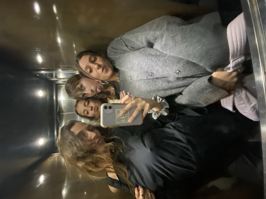 Four young adult females are depicted in a selfie taken in an elevator in the city of Athens, Greece