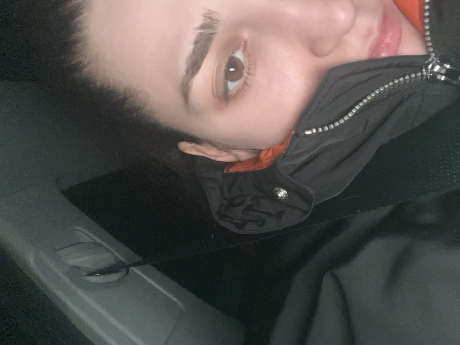 A person's face is visible, predominantly their right eye and part of their mouth. They wear a zipped-up black jacket with an orange collar lining. The background shows a car interior, including a gray panel with an attached object. The photo is rotated counter-clockwise, with the person's face tilted. The lighting appears natural, casting subtle shadows.