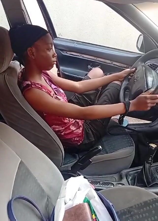 young woman sitting in the driver's seat of a car, with her hands on the steering wheel. She is wearing a sleeveless top, dark shorts, and a black head covering. There is a bag on the passenger seat next to her, and the car's interior appears to be a bit worn. She seems to be listening attentively, possibly to instructions or music, as she keeps her gaze focused ahead. The car is stationary, and the overall lighting suggests it is daytime.