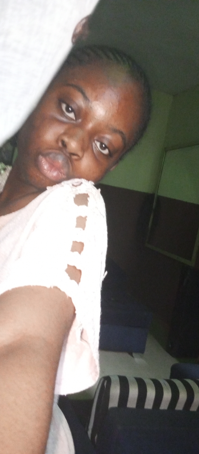 A young woman with dark skin gazes into the camera. Her hair is styled in neat braids. She wears a light-colored, textured top with square cutouts on the shoulder. The background is dimly lit, revealing a dark blue upholstered chair and a black and white striped headrest. The room appears to be painted in shades of green and black. The lighting creates shadows, accentuating the contrast between her skin and the fabric she is wearing.
