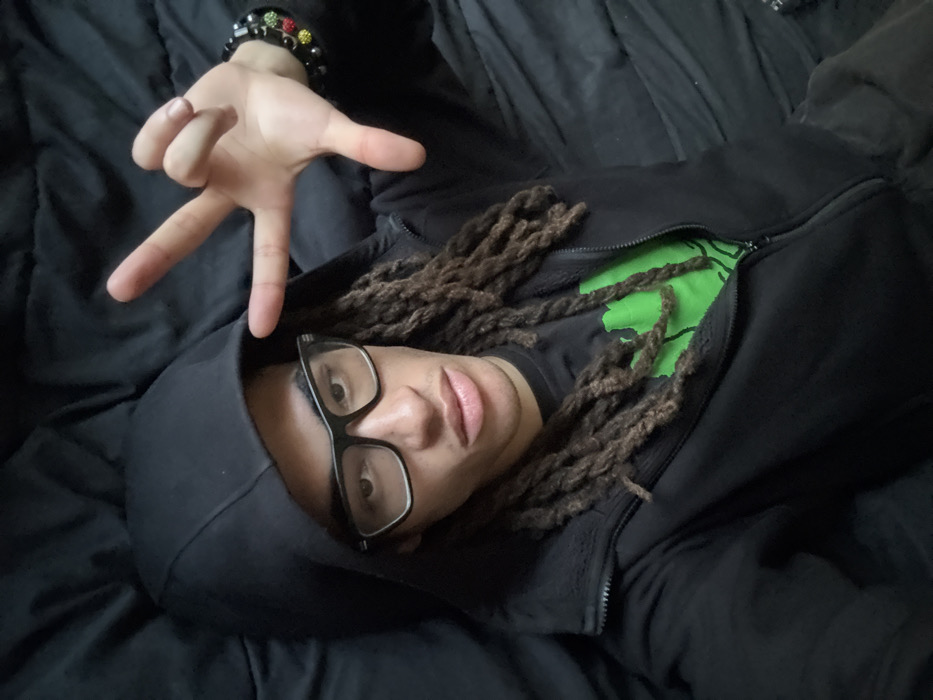 A person with dreadlocks and glasses lies on a black bed, wearing a black hoodie partially zipped to reveal a green shirt