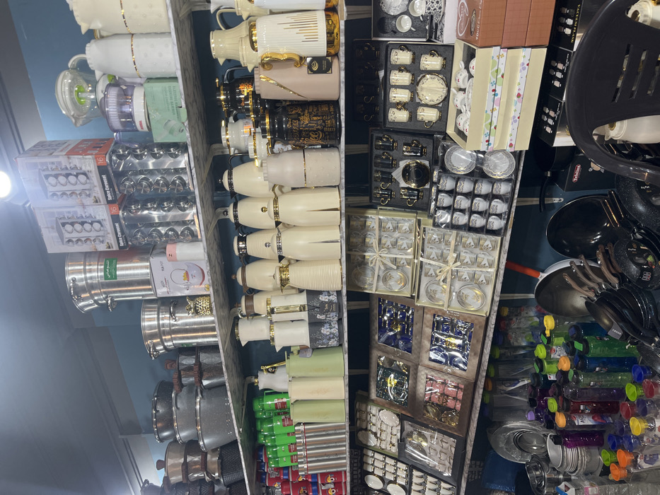 Shelves are filled with kitchenware. Pitchers, spice racks, pots, and pans fill the left shelves. Tea and coffee sets in decorative boxes are stacked in the middle. To the right, pans and cooking utensils are on display, along with stacks of colorful water bottles and plates.