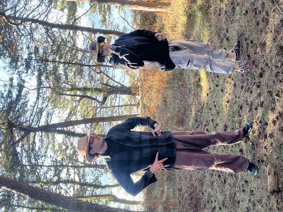 The image depicts two adult males standing in a sunlit pine forest in Kavač, Montenegro. The individual on the left, an adult male, wears a light brown wide-brimmed hat, orange-tinted sunglasses, a black turtleneck, a dark grey and black plaid long-sleeved shirt, reddish-brown cargo pants, and dark athletic shoes. He has a silver-colored watch on his left wrist and a ring on his right ring finger. His left hand is on his hip, and his right hand, also on his hip, displays a two-finger "peace" gesture. He is looking towards the right side of the frame. The individual on the right, also an adult male, wears a dark bucket hat with ear flaps, gold-tinted reflective aviator-style sunglasses, a black hooded sweatshirt, light grey cargo pants cuffed at the ankles, and burgundy and white athletic shoes (identifiable as New Balance on one shoe). He has a black waist bag or fanny pack worn diagonally across his chest. His right hand is raised to his mouth or chin area, revealing a tattoo on the back of his hand, while his left hand is held at his side. He appears to be looking downwards or slightly to his left. The ground is covered with dry grass, pine needles, and numerous fallen pine cones. A small fallen log or branch lies in the lower left foreground. Tall, slender coniferous trees with sparse foliage and some vines dominate the midground and background. Beyond the trees, a body of water and distant hills are visible under a clear, bright sky, indicating sunny conditions.