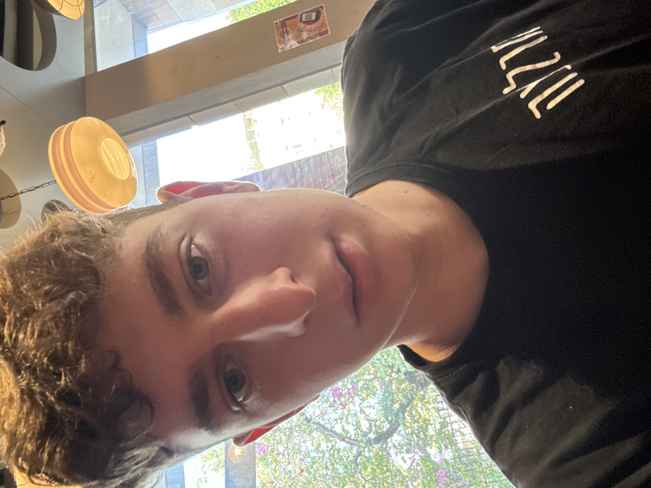 A young man with fair skin, short curly brown hair, and blue eyes looks at the camera. He wears a black t-shirt with white writing on the upper right. A window reveals a tree with light green leaves and faint purple flowers. The backdrop is an indoor setting, including hanging circular lights, and upper window. The angle is slightly above the subject.