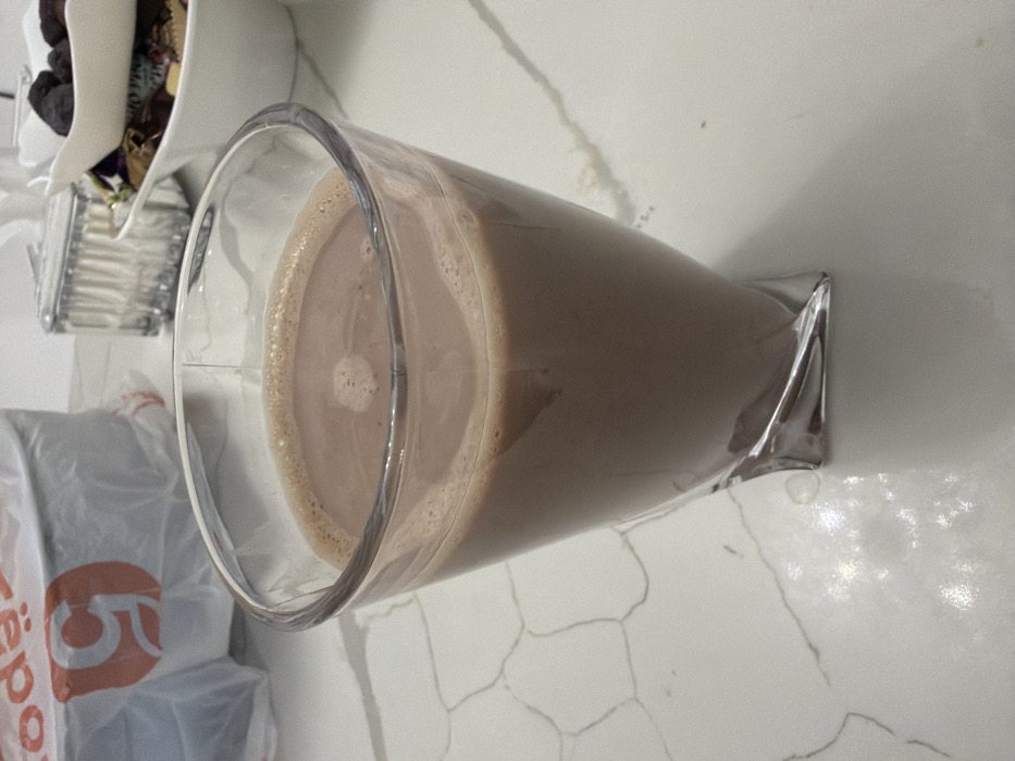 - "A glass of chocolate milk rests horizontally on a white countertop with a marble-like pattern" by FM-Ssc0d2, licensed under CC BY 4.0