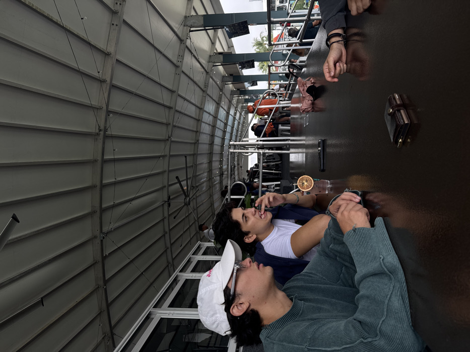The scene depicts an open-air or semi-enclosed covered structure in Miami Gardens, United States of America, under an overcast sky. Three individuals are seated at a dark, highly reflective table in the foreground. On the far left, a male wears a white baseball cap, glasses, and a teal ribbed long-sleeved shirt, observing to the right. Beside him, a second male, wearing a white t-shirt and a dark open shirt, has his right hand near his mouth and is looking to the left. The hands and forearms of a third individual, wearing dark long sleeves and multiple bracelets, are visible on the far right of the table. Objects on the table include a clear glass containing a beverage with a dehydrated orange slice garnish, a black smartphone, and a brown leather wallet. The overhead structure consists of a light-colored, paneled roof supported by metal beams, featuring string lights and a large ceiling fan. In the background, additional patrons are visible within a leisure or dining area characterized by metal railings and tiered seating. Palm trees are discernible in the distant background on the right.