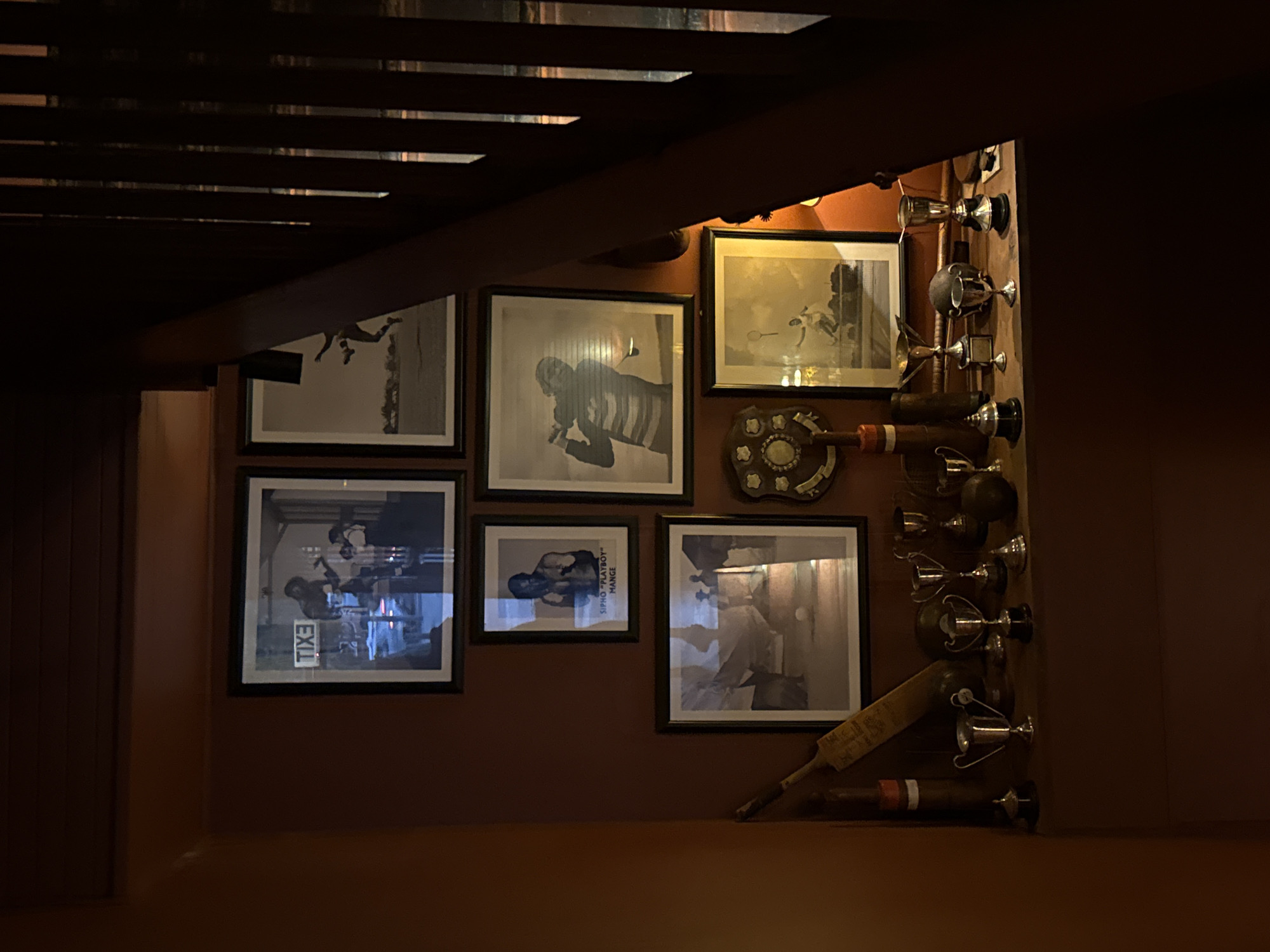 An under-stairs nook in a building in Cape Town, South Africa is decorated with framed monochrome photos of what appear to be sports figures and scenes, likely related to cricket or tennis. A cricket bat and trophies are affixed to the wall amongst the photographs. The wall is painted a terracotta or reddish-brown color. The area is dimly lit, creating deep shadows. Stairs are visible at the top of the frame.