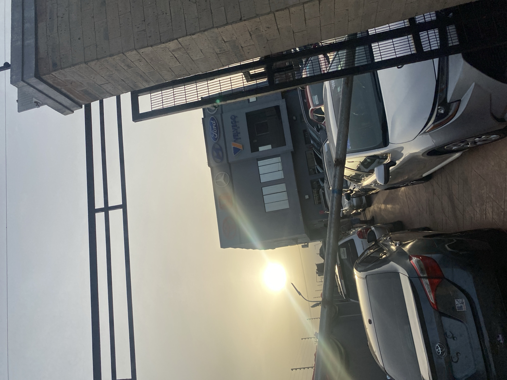 dealership in Akowonjo, Nigeria. The building has logos for Ford, Hyundai, and Veltyco. Parked in front of the building are several cars, including a gray Toyota and a white car. The sun is bright in the sky, creating a hazy effect. The photo is taken from an unusual angle, partially obscured by a metal structure overhead and a column on the left.