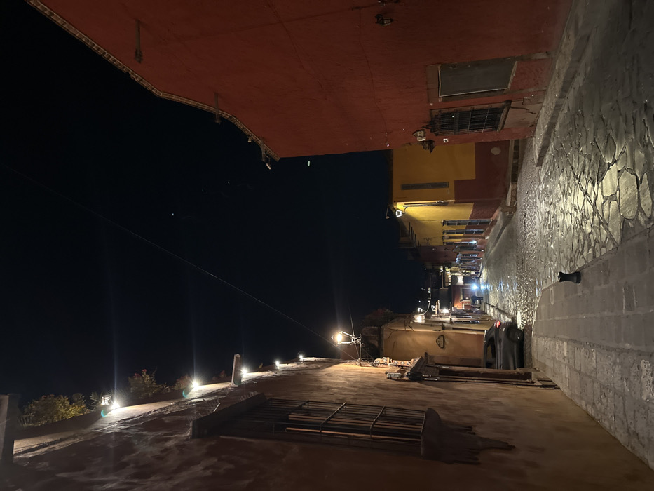The image is an upside-down perspective of a night scene. A red ceiling looms at the top, contrasting with the dark night sky. Below, a pathway lined with evenly spaced lights leads toward buildings illuminated with warm hues. A textured, gray stone wall runs vertically along one side, providing a sharp contrast to the dark expanse. Miscellaneous construction materials are on the foreground of the pathway.