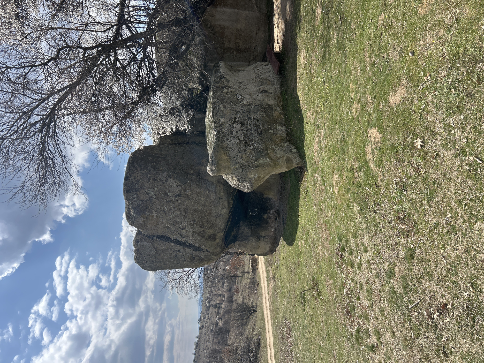 The image displays a rural landscape in Mala Fucha, Bulgaria, under a partly cloudy sky. The foreground consists of sparse green grass intermixed with patches of dry brown grass, fallen leaves, and small twigs. Dominating the scene are several large, weathered grey-brown boulders, exhibiting varied textures and lichen growth. A prominent rock formation on the left is segmented by a vertical fissure, appearing as two stacked masses. To its right, another significant boulder features a shadowed overhang, beneath which a single, dark reddish-brown wooden bench is positioned directly on the ground. Behind and above the rocks, a deciduous tree with numerous small white blossoms is visible, alongside other trees with bare branches. In the mid-ground, a light brown dirt road winds through the terrain, receding towards the background. The background features rolling hills with sparse, deciduous trees and scrub vegetation, extending beneath a blue sky populated by scattered cumulus clouds. No individuals or animals are present in the scene. The lighting indicates direct sunlight, casting distinct shadows on the ground and under the rock formations.