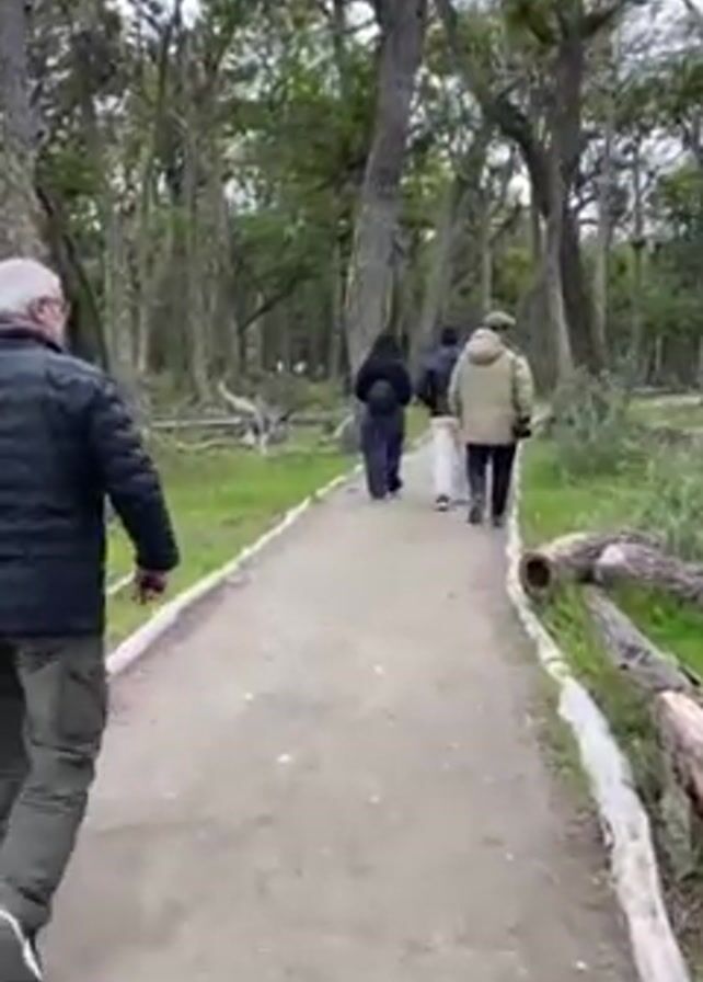 A group of four people are walking along a dirt path in a forest. The person filming is walking slightly behind the group. The first person in the group is a man in a black puffer jacket and khaki pants. The other three people are walking closer together, and are wearing darker clothing. The path is lined with logs on either side. There are tall, thin trees with gray bark on either side of the path. The forest floor is covered in grass and fallen leaves. The sky is overcast.