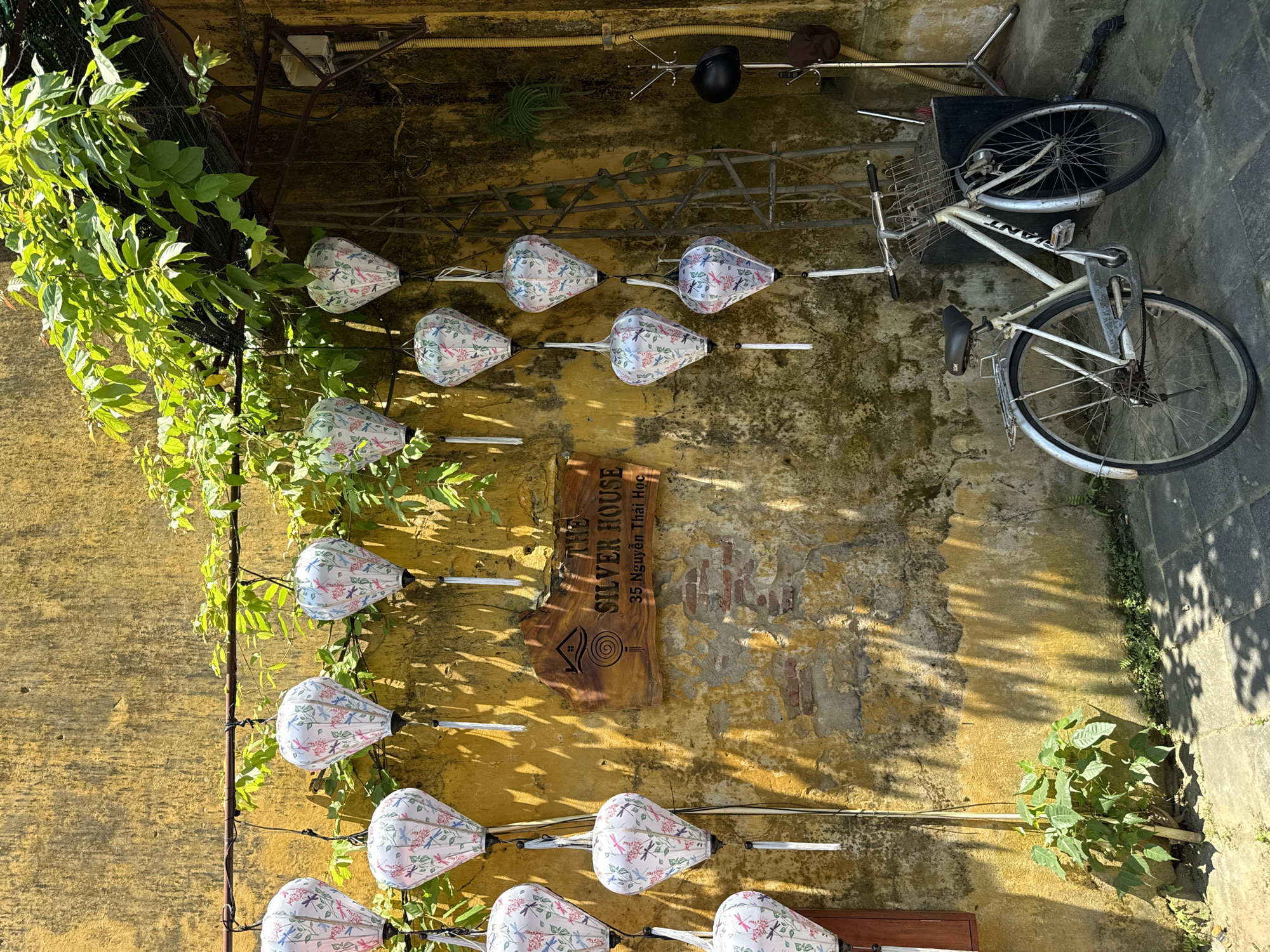 The image depicts a sunlit exterior wall in Hội An Ward, Vietnam. The wall is predominantly yellow, with patches of discolored mortar and exposed brick. Hanging on the wall are strings of white, teardrop-shaped lanterns with floral designs. A wooden sign reads "THE SILVER HOUSE" in English and "35 Nguyen Thai Hoc" in Vietnamese. A white bicycle leans against the wall to the right of the lanterns and sign. Above the bicycle are helmet and hat hanging from the wall. Green plants grow at the base of the wall and over the top edge. The ground is paved with stone slabs.