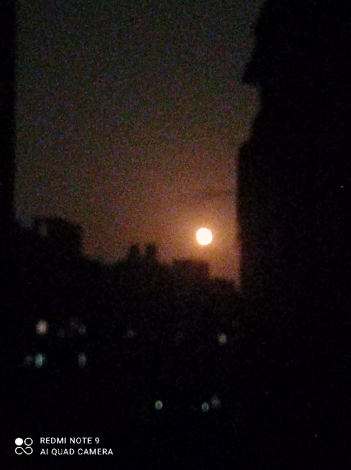 The image captures a grainy, low-light nocturnal urban vista, purportedly in Khan Yunis, Palestinian Territory. A prominent, bright, yellowish-white orb, consistent with the moon, is centered in the upper-right quadrant against a dark, reddish-brown, hazy sky. The foreground and midground are dominated by deep black silhouettes of structures and dense foliage, forming an irregular horizon line. A large, dark, vertical structural element, likely a building or window frame, borders the right edge, partially overlapping the sky and moon. Multiple indistinct, out-of-focus light sources, appearing as circular bokeh in white, green, and blue hues, are scattered across the lower half of the frame, indicating distant artificial illumination. No human figures or specific actions are identifiable. The bottom-left corner displays a digital watermark: "REDMI NOTE 9 AI QUAD CAMERA."