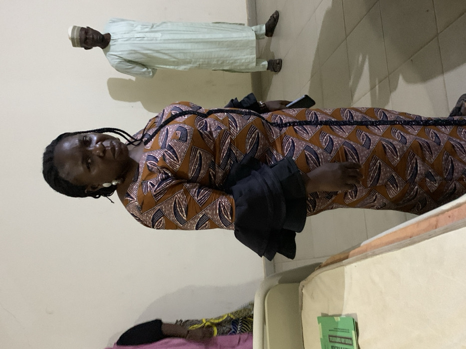 Two people are indoors. A man stands in the background, wearing a long, light-colored robe and a cap. A woman stands in the foreground, wearing a brown patterned dress with black accents at the waist and sleeves. She is facing the camera with her arms at her sides. Some objects are visible in the lower portion of the frame, including a book.