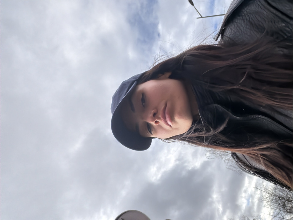 A low-angle self-portrait depicts a female subject against an overcast sky in the city of Unknown, Unknown. The subject, centered in the frame, has long, dark hair and wears a dark blue baseball cap, brim forward. She is dressed in a dark, possibly leather, jacket with a high collar, which appears textured. Her facial expression is neutral, with lips slightly parted, and her gaze is directed towards the camera. The background consists predominantly of a heavily clouded sky, with visible patches of lighter sky. To the far left, a partial view of a light-colored, circular object is present. To the right, a dark street light pole with a distinct fixture is visible, along with blurred outlines of bare trees.
