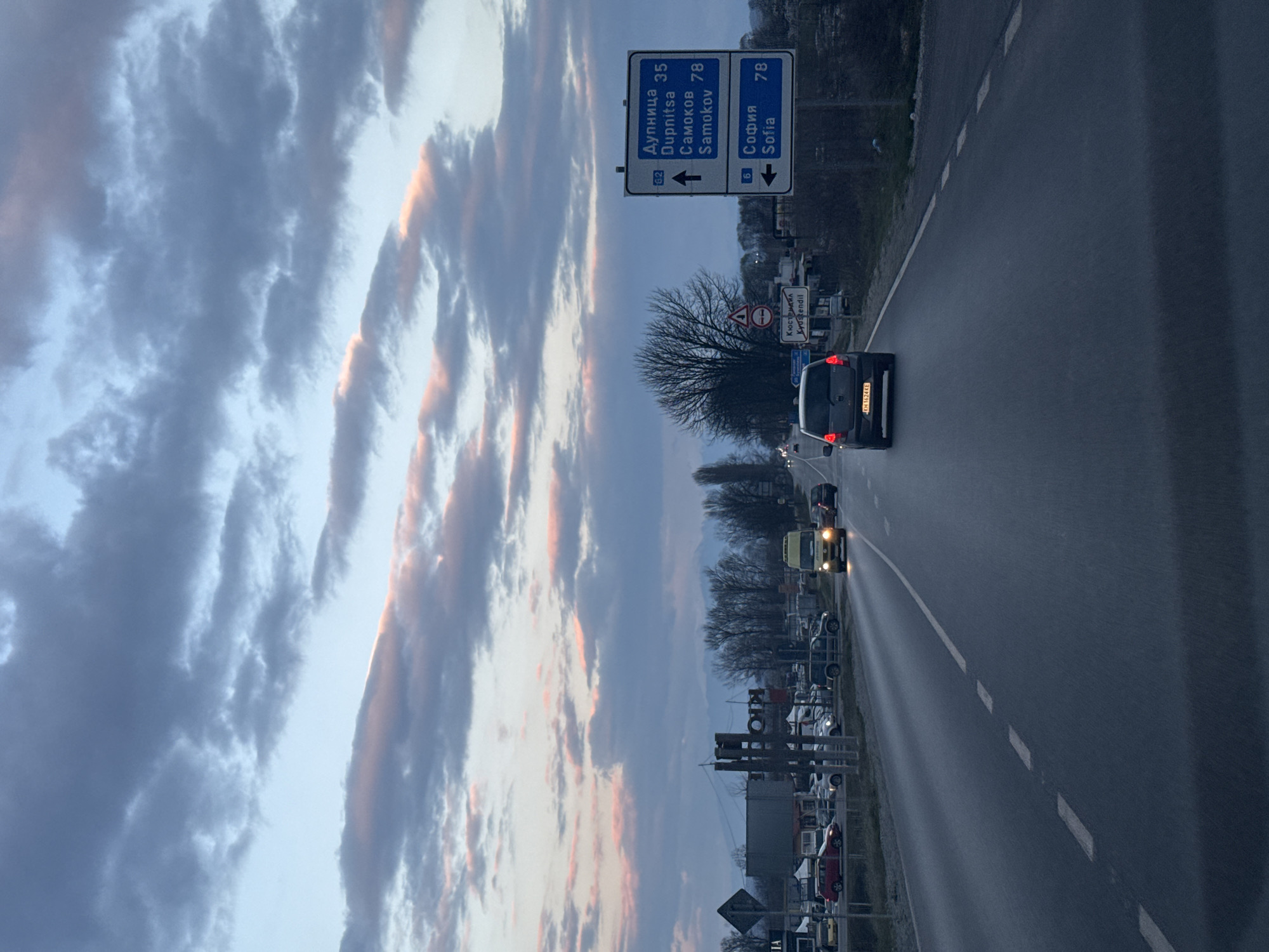The scene depicts an asphalt road at dusk on the outskirts of Kyustendil, Bulgaria, facing generally east or northeast