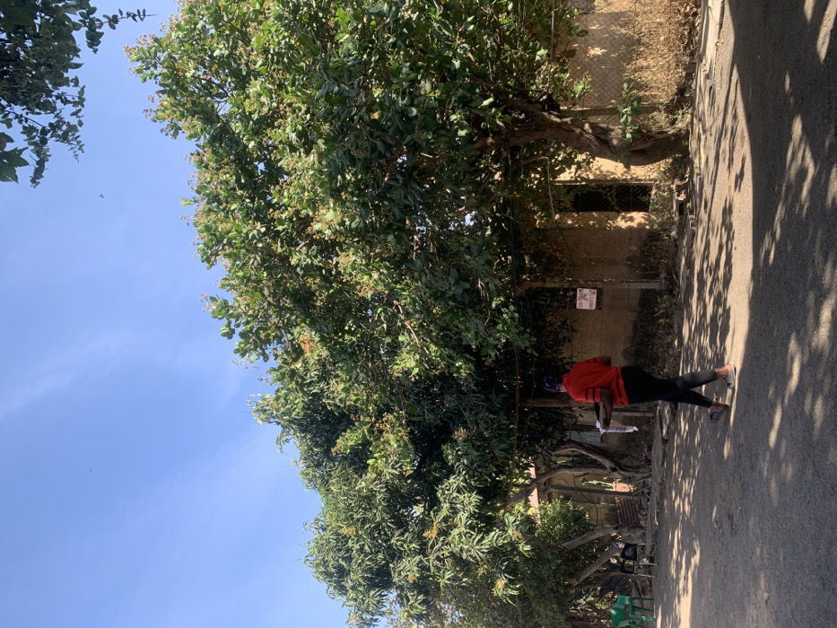The image displays an outdoor scene in Jos, Nigeria, under a clear blue sky. A single individual, seen from behind, walks from left to right across an unpaved dirt path. The person is wearing a red short-sleeved top, black leggings, and dark sandals, carrying a dark rectangular tray with a white cloth draped over it at waist level. The path is marked by prominent shadows cast by the trees overhead. The background features dense green foliage from several mature trees, including a mango tree on the left and another leafy tree on the right. Beneath the trees and behind a metal chain-link fence, low-rise, earthen-toned structures with weathered walls are visible. A small sign with red lettering on a white background is affixed to the fence. An open doorway is present in the structure on the far right. To the far left, two green plastic chairs are partially visible under the trees. The scene is brightly illuminated by direct sunlight.