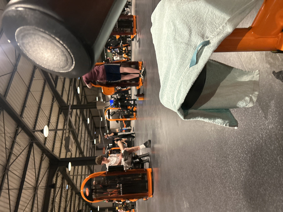 A gym setting features rows of orange Matrix exercise machines occupied by people working out. The perspective is skewed, highlighting a black machine component in the foreground and a light blue towel draped over another. The gym boasts high ceilings with metal beams and evenly spaced lights. Some machines are empty, and the floor appears smooth and polished.