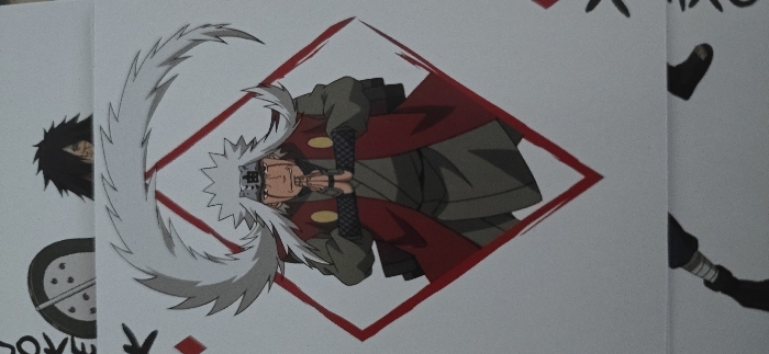 The image displays a vertical arrangement of three overlapping playing cards on an unidentifiable light-colored surface. The prominent central card features a stylized anime character, Jiraiya from the Naruto series, rendered in vibrant colors against a white background. This character is depicted with long, spiky white hair, a metallic headband inscribed with the Kanji for "Oil" (油), and red markings extending from beneath his eyes. He wears a red vest-like garment over a darker, possibly grey or olive, outfit, with his hands clasped together in a traditional Japanese prayer or meditative gesture. A bold red diamond-shaped outline encircles the character. Above this central card, the top edge of a second card is partially visible. It shows the upper head and spiky black hair of another anime character, resembling Madara Uchiha, with glimpses of red around his eyes. A portion of the word "JOKER" is discernible along the left edge, alongside a circular, segmented design. Below the central card, the very top edge of a third card is visible, revealing a small section of a black-clad leg or foot. The overall scene shows a still life arrangement of anime-themed playing cards. There is no visual information within the image to indicate a specific location in Bergen, Norway, or any other city.