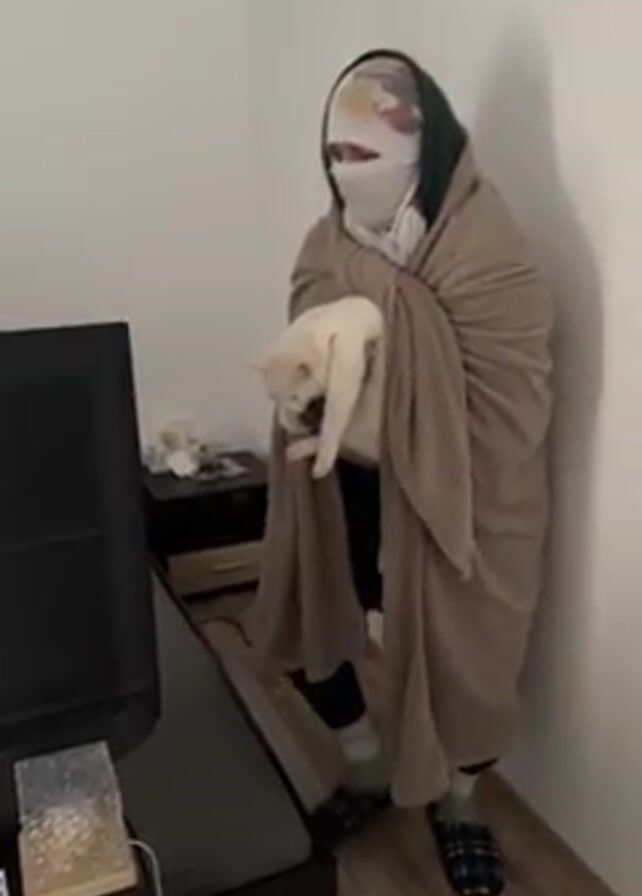 A person wrapped in a beige blanket and wearing a face covering is holding a white cat in their arms, while standing in a room